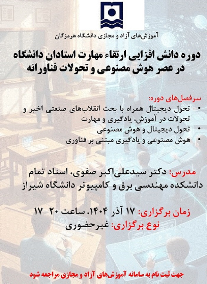 با همکاری معاونت آموزش و تحصیلات تکمیلی دانشگاه هرمزگان و آموزش های آزاد و مجازی، دوره دانش افزایی ارتقاء مهارت استادان دانشگاه در عصر هوش مصنوعی و تحولات فناورانه، به شکل مجازی برگزار خواهد شد.