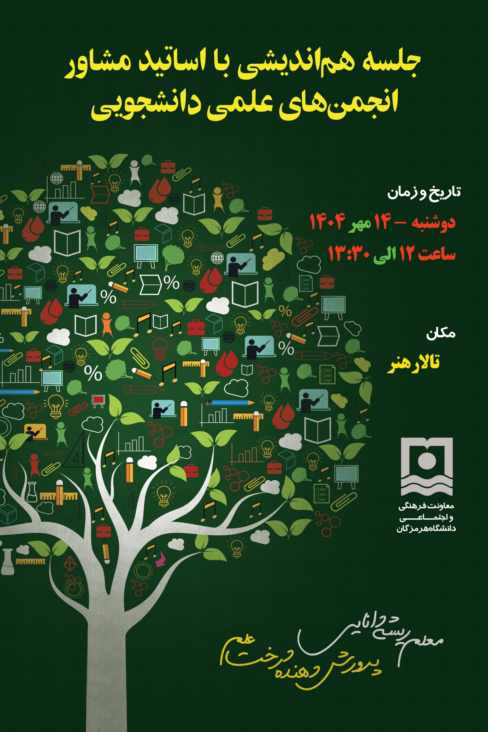 این نشست تخصصی که بستری ایده‌آل برای همفکری، تبادل نظر و ارتقای همکاری بین اساتید مشاور و معاونت فرهنگی و اجتماعی است، در تاریخ دوشنبه ۱۴ مهرماه ۱۴۰۴، از ساعت ۱۲ تا ۱۳:۳۰ در تالار هنر دانشگاه هرمزگان برگزار خواهد شد.