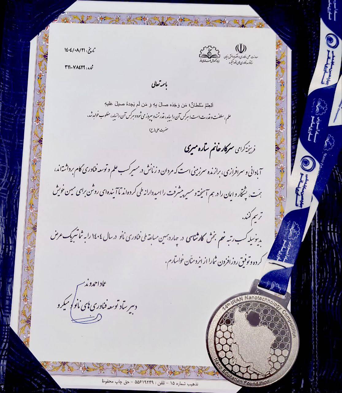 سرکار خانم ستاره میری، دانشجوی مقطع کارشناسی دانشگاه هرمزگان، موفق به کسب مدال نقره چهاردهمین دوره مسابقات ملی فناوری نانو در بخش کارشناسی شد.